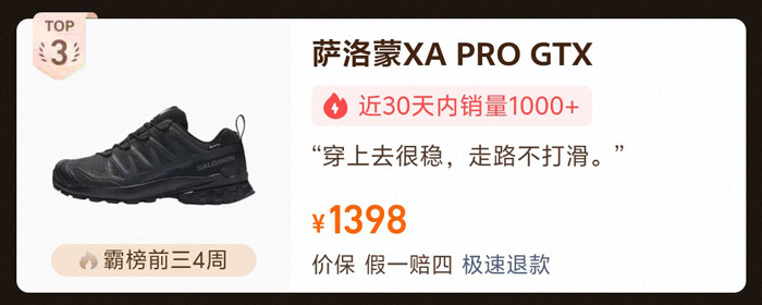 作为榜单蝉联榜首6天的明星产品,该款徒步鞋参考售价1600元,近30天销量突破1000+,累计销量达3000+。产品以极致穿着体验为核心,搭载专业防滑耐磨材质,可轻松应对林间、山地、碎石路等多种复杂地形,精准解决户外徒步中行走不稳、鞋底易磨损的痛点,是男性专业徒步爱好者的首选装备。