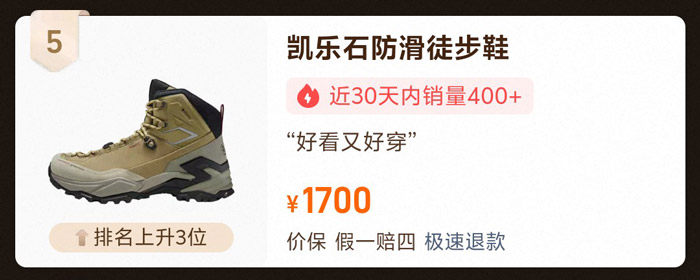 该款产品参考售价1700元,榜单排名环比上升3位,近30天销量 400+,累计销量达7000+。作为国产高端户外鞋履代表,其搭载 VIBRAM 耐磨大底与 5MM 鲨齿纹路,实现超强抓地效果;GORE-TEX 材质兼顾持久防水与高效透气,大幅延长产品使用寿命;全掌调节系带优化长距离行走体验,亚洲人专属鞋楦彻底解决磨脚痛点;1.68MM 头层牛皮鞋面搭配橡胶防撞设计,中帮靴筒强化脚踝防护,全方位抵御撞击、扭转、崴脚风险,是长距离登山徒步的理想装备。