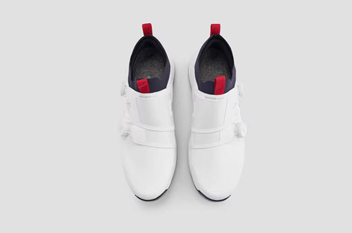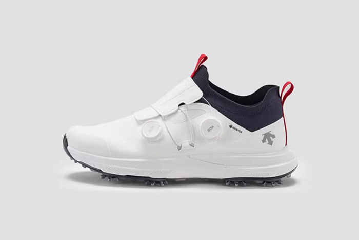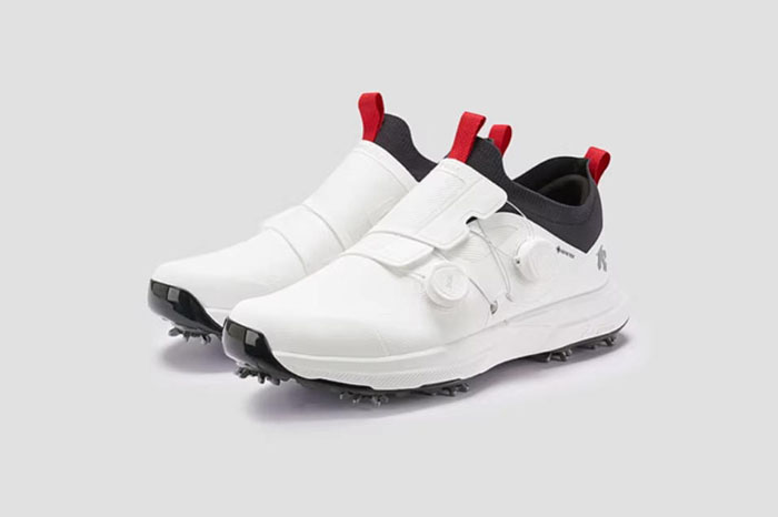 设计层面,新款PRO系列延续迪桑特专业运动美学核心理念,构建适配高尔夫场景的专属视觉语言。鞋款以经典纯净白为主色调,搭配质感藏青色针织袜套鞋领,辅以灵动红色细节点睛,整体造型兼具运动活力与商务轻奢质感,既契合高尔夫球场优雅专业的穿搭氛围,也可适配日常休闲、轻商务等多元场景,实现运动与格调的无缝衔接。