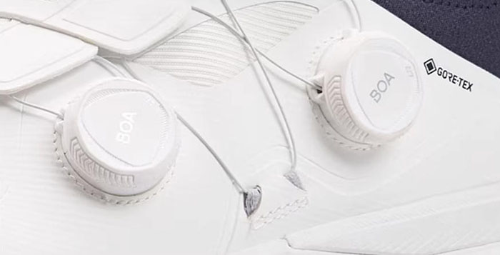 鞋身配备双 BOA® Fit System 旋转旋钮,可针对前掌与足弓两大受力区独立调节松紧,实现毫米级个性化包裹。专利钢丝系带耐用性拉满,球手在挥杆、行走、转体等状态下,无需弯腰即可快速调紧,搭配魔术贴搭扣双重固定,强效强化前掌支撑,避免挥杆发力时脚部滑动,显著提升发力效率与运动稳定性。