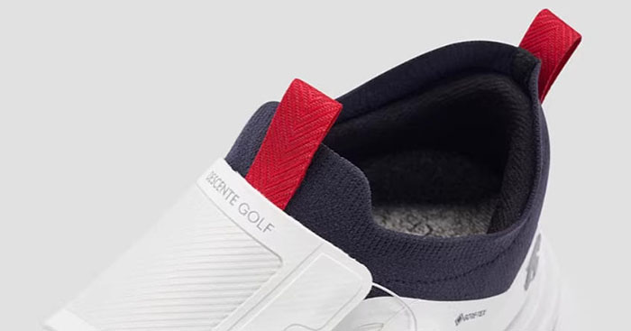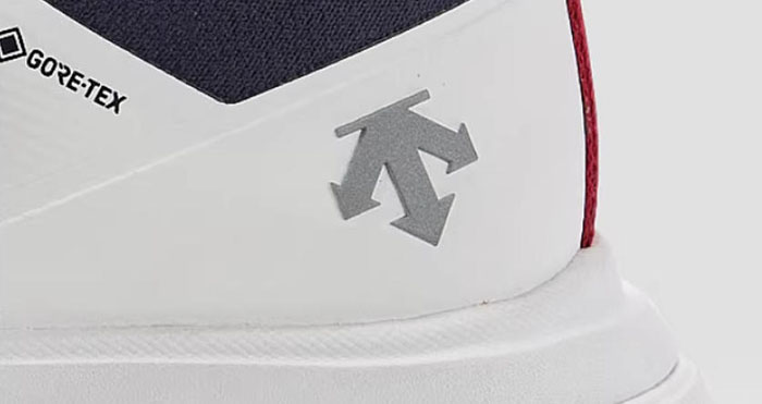工艺细节上,鞋款采用袜套式一体化结构,针织鞋领紧密贴合脚踝,在提供全方位包裹感的同时,大幅提升穿脱便利性;鞋身前后设置红色提带,既优化穿脱体验,又成为视觉亮点,注入鲜活运动气息;鞋帮处印有DESCENTE GOLF专属标识,清晰彰显专业高尔夫定位;后跟处融合迪桑特标志性箭头 logo 与 GORE-TEX® 科技标识,直观传递品牌专业调性与核心科技配置;鞋头搭载高韧性防撞包边,有效抵御运动冲击、保护脚趾,同时提升鞋款耐用性,适配高尔夫高频次、长时长的使用特点;鞋面以轻量化材质打造,线条流畅利落,兼顾运动灵活性与高阶视觉质感。