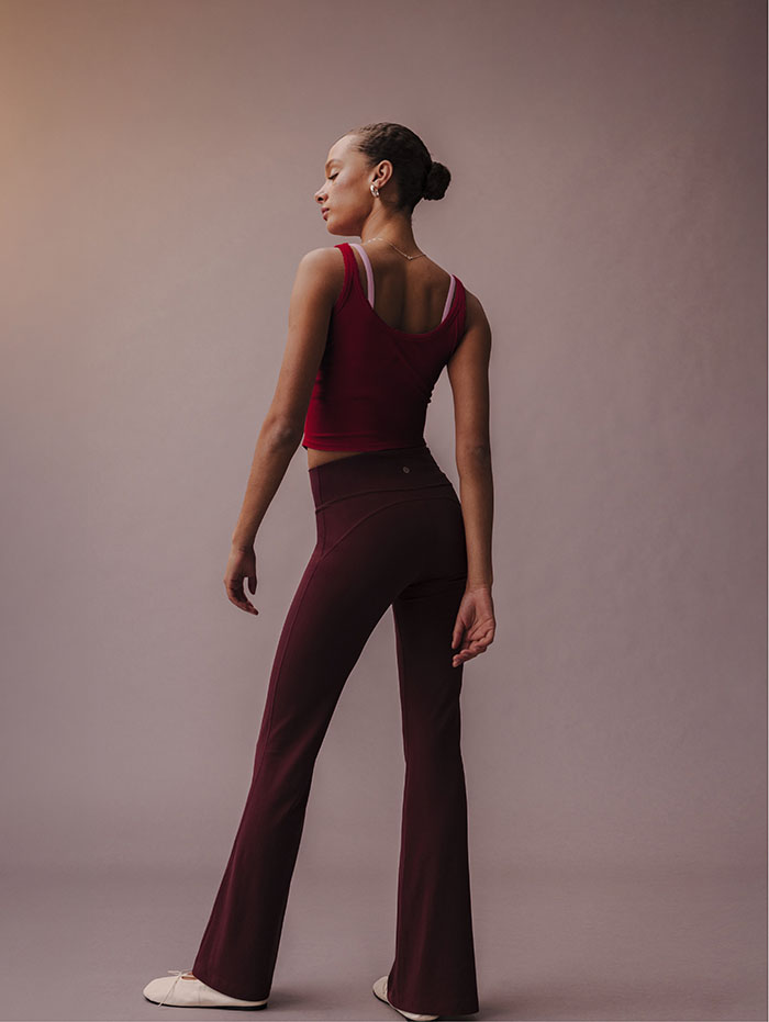 为女性量身打造的 Groove No Line 运动高腰喇叭裤,堪称本次系列的点睛之笔。甄选 lululemon 标志性的 Nulu™面料,触感轻盈如云朵,柔滑得仿佛第二层肌肤,上身即能感受到无负担的贴合感。设计师巧妙简化前侧腰部缝线,既减少了穿搭摩擦带来的不适感,更让身形线条显得愈发流畅利落;而后侧腰际的弧形缝线,则暗藏玄机地勾勒出一枚精致爱心轮廓,行走间若隐若现,将细腻浪漫藏于不经意间,让运动与约会场景的切换毫无违和。