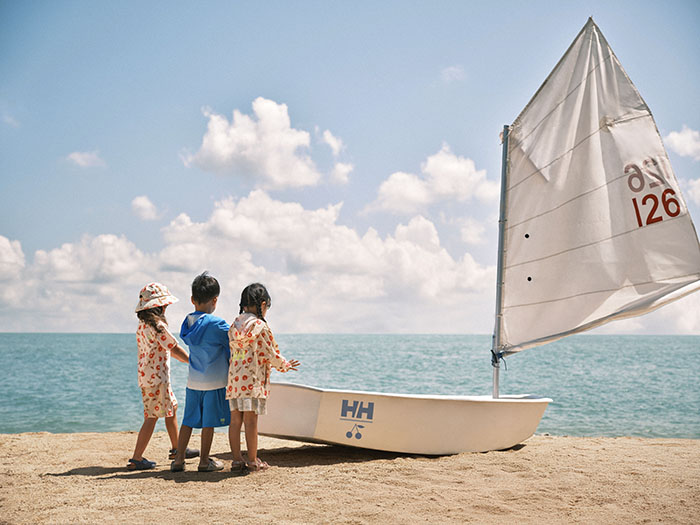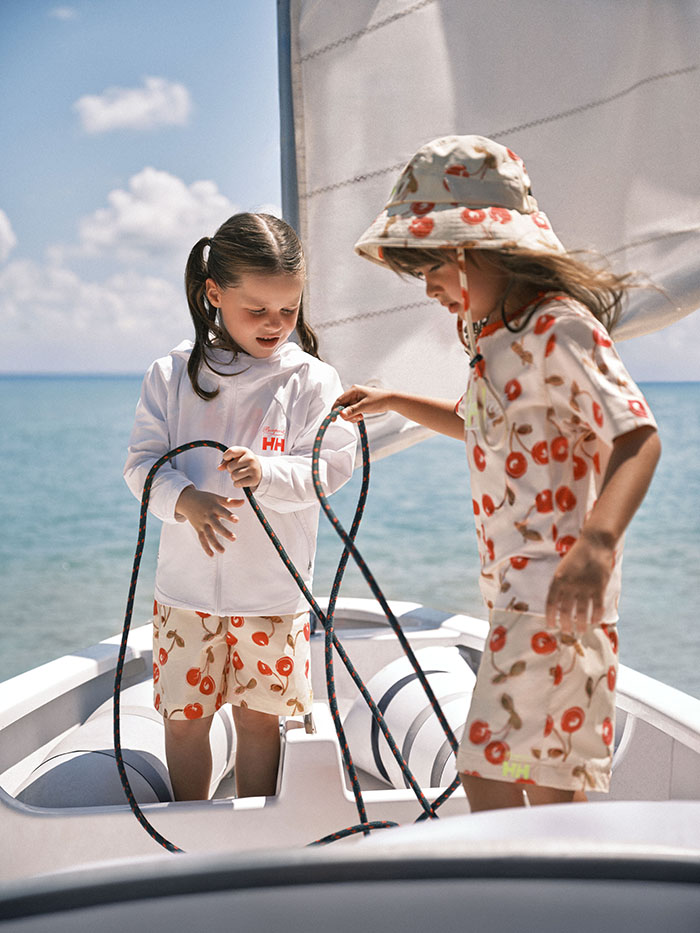 在设计美学层面,联名系列以双品牌标志性 Logo 的视觉对话,拉开北欧户外与法式美学的碰撞序幕。图案创作从 HELLY HANSEN 经典帆船绳索中汲取灵感,以简约流畅的线条勾勒刻入品牌 DNA 的户外基因,搭配层次化温和印花工艺,既清晰传递品牌精神,又以细腻触感规避面料粗糙感,全方位呵护儿童娇嫩肌肤。男童系列以澄澈蔚蓝色调铺陈海岸氛围感,利落剪裁适配户外探索与日常出行;女童系列则融入 Bonpoint 经典樱桃元素,于细节处点缀灵动童趣,让户外廓形兼具优雅与活泼,无论是周末亲子露营、城市漫步,还是轻户外出游、校园日常,都能轻松驾驭风格,实现颜值与实用性双向在线。