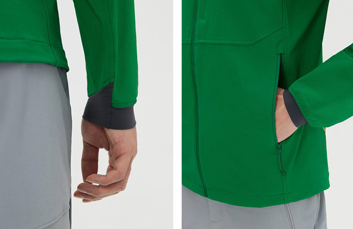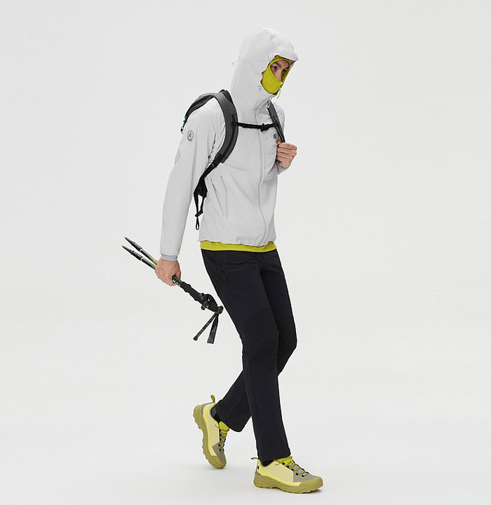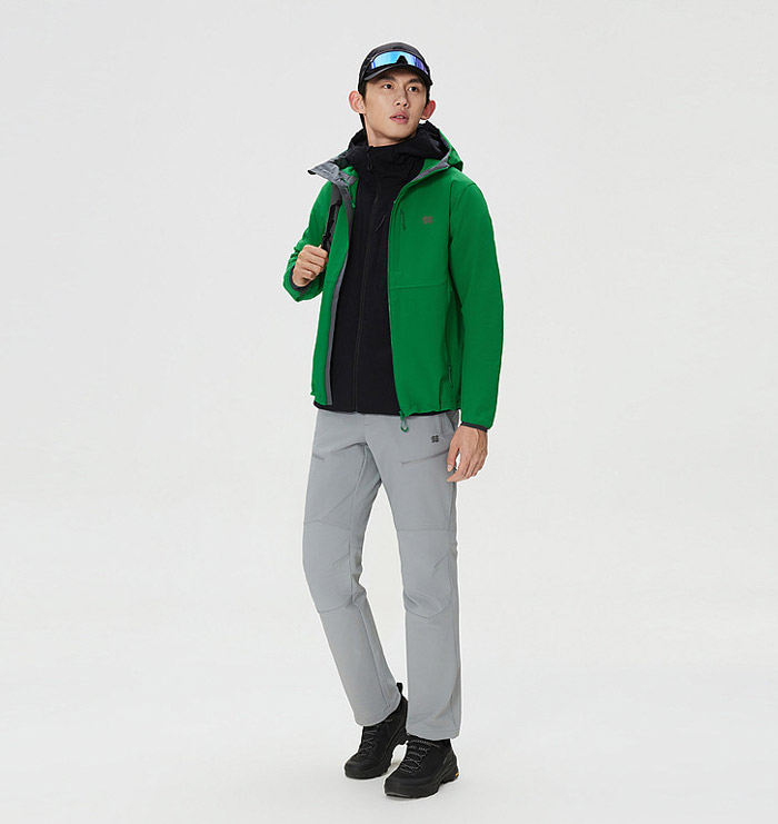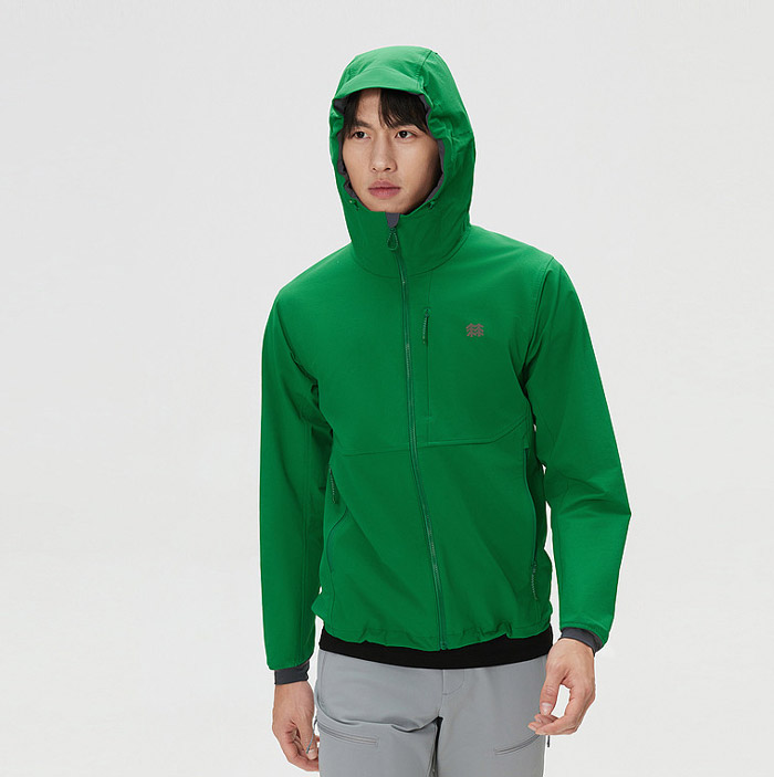 设计美学上,这款软壳衣延续可隆简约高级的设计语言,提供浅灰、鲜绿两款经典配色,低饱和色调兼顾户外场景的视觉辨识度与都市通勤的低调审美,不挑穿搭场景与内搭风格。衣身采用修身利落剪裁,搭配一体化连帽结构与流畅线条,彻底摒弃户外装备常见的臃肿感,视觉上更显干练挺括,既可搭配专业登山裤、户外徒步鞋组成全套户外造型,也能适配休闲裤、牛仔裤等日常单品,轻松实现 “一衣多穿” 的穿搭自由。