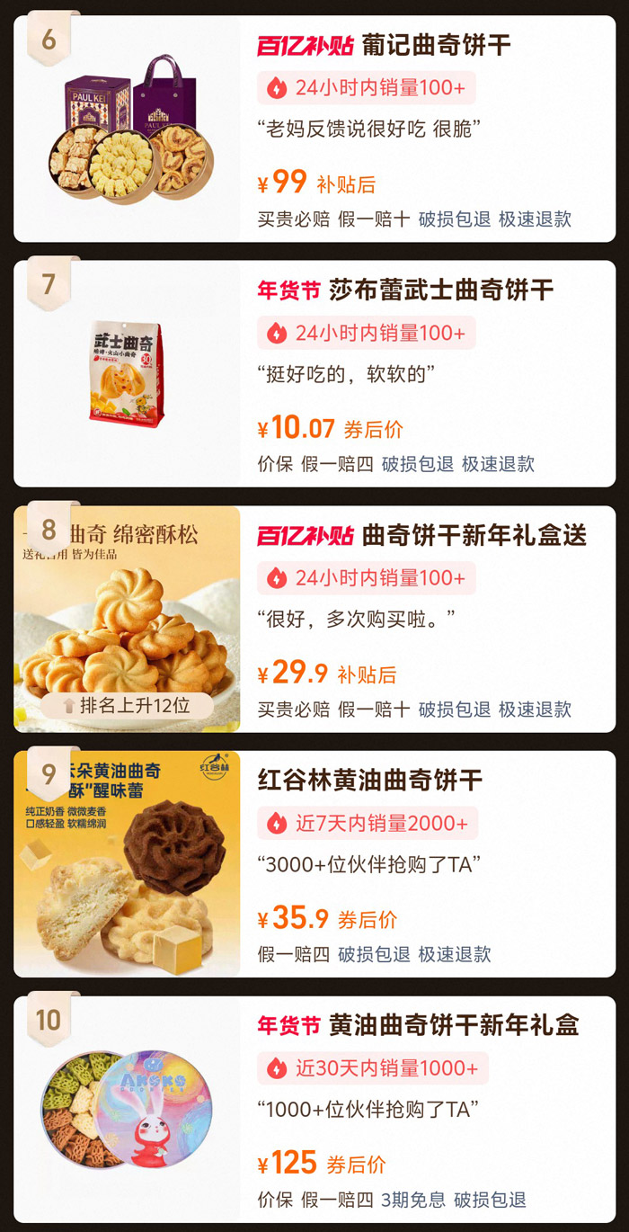 TOP6「澳门葡记小圆盒系列曲奇饼干」以 99 元补贴价延续经典风味,浓郁奶香融合酥松质地,24 小时 100 + 的销量彰显老牌实力。