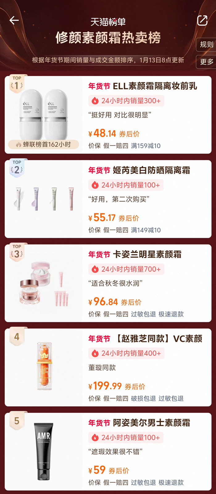 从本次榜单不难看出,多功能合一、高性价比、针对性强已成为素颜霜市场的核心消费趋势。无论是明星同款、男士专属,还是平价爆款、养肤黑科技,十大单品各有千秋,覆盖不同肤质、预算与需求。年货节狂欢仍在继续,这份经过市场检验的权威榜单,无疑是你的 “购物指南针”,赶紧锁定心仪单品,用精致素颜开启 2026 新一年!