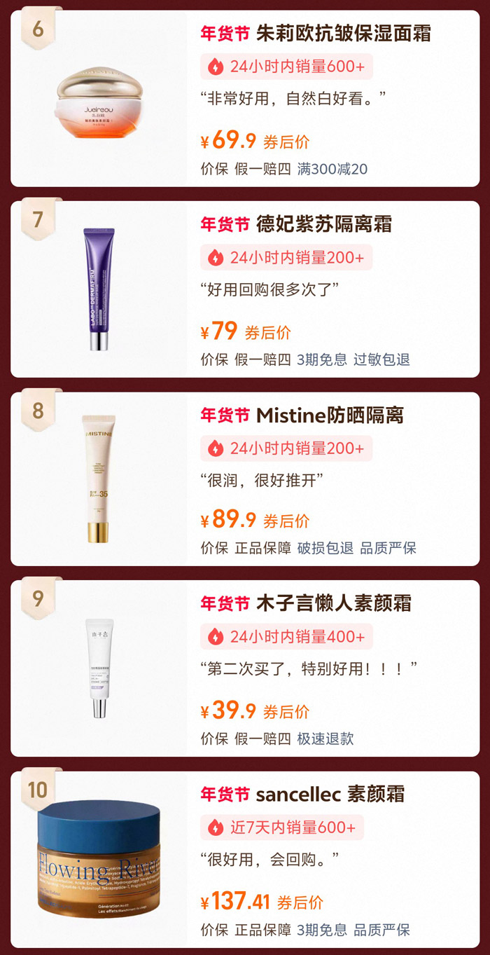 TOP6 的朱莉欧臻颜美肤素颜霜,以 69.9 元的高性价比强势突围,24 小时销量 600 + 件,累计销量 9 万 + 件。其轻薄服帖的质地与自然提亮的效果,完美适配各种肤质,堪称 “闭眼入” 的平价宝藏。