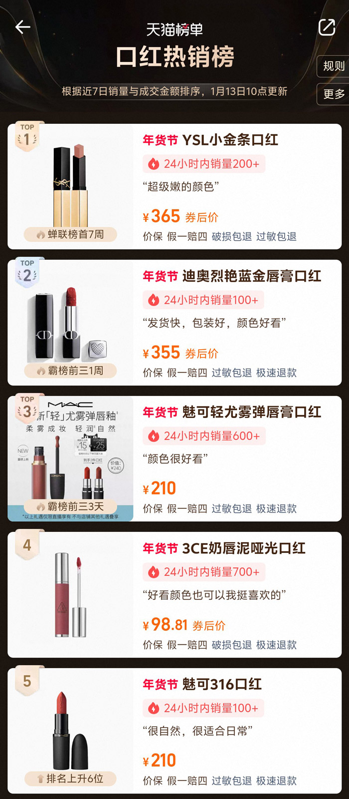 2026年1月,天猫榜单——爆款口红热卖榜前十名曝光(数据截止至1月13日10点,根据淘宝天猫平台近7天销量与成交金额排序,仅供参考)。每一款都堪称唇部潮流的 “流量密码”,从顶奢经典到平价黑马,全方位承包你的开年氛围感唇妆,跟着买准没错~
