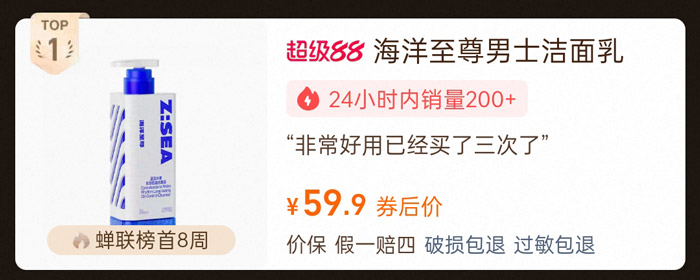 作为榜单蝉联8周的榜首产品,海洋至尊三棱镜洗面奶2.0 券后售价仅59.9,凭借出众的控油抗痘效果收获海量消费者认可。产品近24小时销量突破200+件,累计销量超70万+件,市场热度持续领跑。