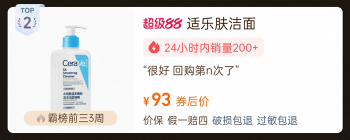 位列榜单前三、稳霸榜单3周的 CeraVe适乐肤水杨酸洗面奶,券后价93,近24小时销量200 + 件,累计销量超30万+件,是敏感肌男士的抗痘优选。