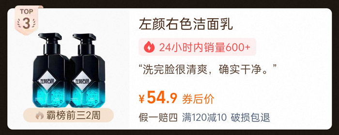 稳踞榜单前三2周的左颜右色男士控油祛痘洗面奶,券后价54.9,近24小时销量高达600+件,累计销量超10万+件,凭借明星代言与硬核功效成为校园热门洁面单品。