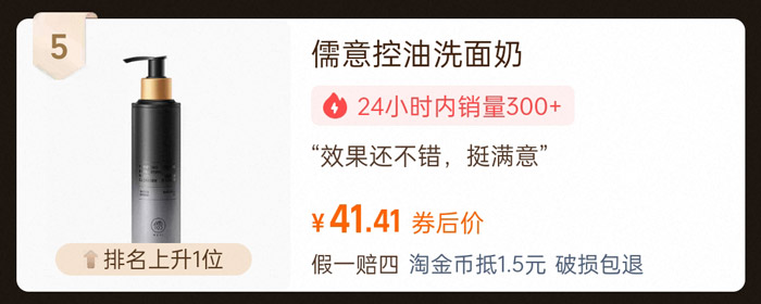 排名同样环比上升1位的儒意男士专用控油祛痘洗面奶,券后价41.41,近24小时销量300+件,累计销量超20万+件,聚焦男士肌肤特点打造专属清洁配方。