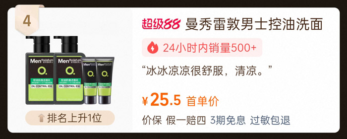 排名环比上升1位的曼秀雷敦男士洗面奶,首单价仅25.5,近24小时销量500+件,累计销量超10万+件,依托百年品牌底蕴成为学生党平价洁面的标杆选择。