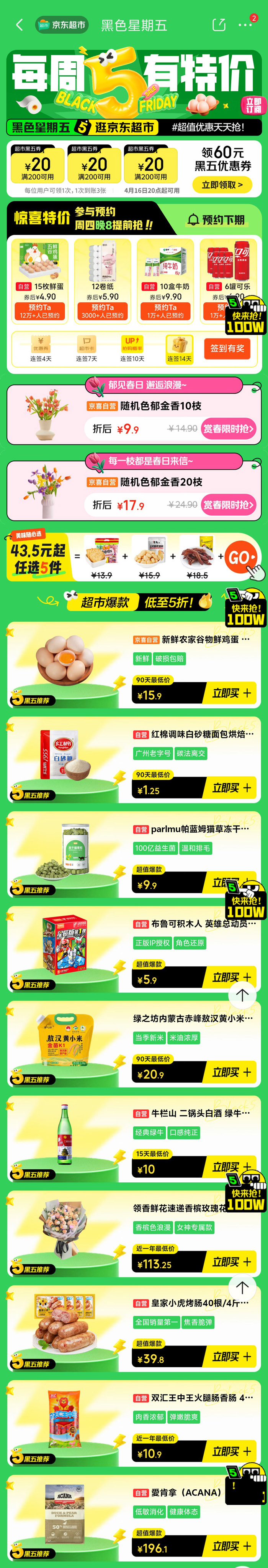 目前,京东超市黑色星期五活动已正式开启预约,消费者可登录京东超市专区,领取优惠券、预约爆款,解锁每周五的超值购物体验。
