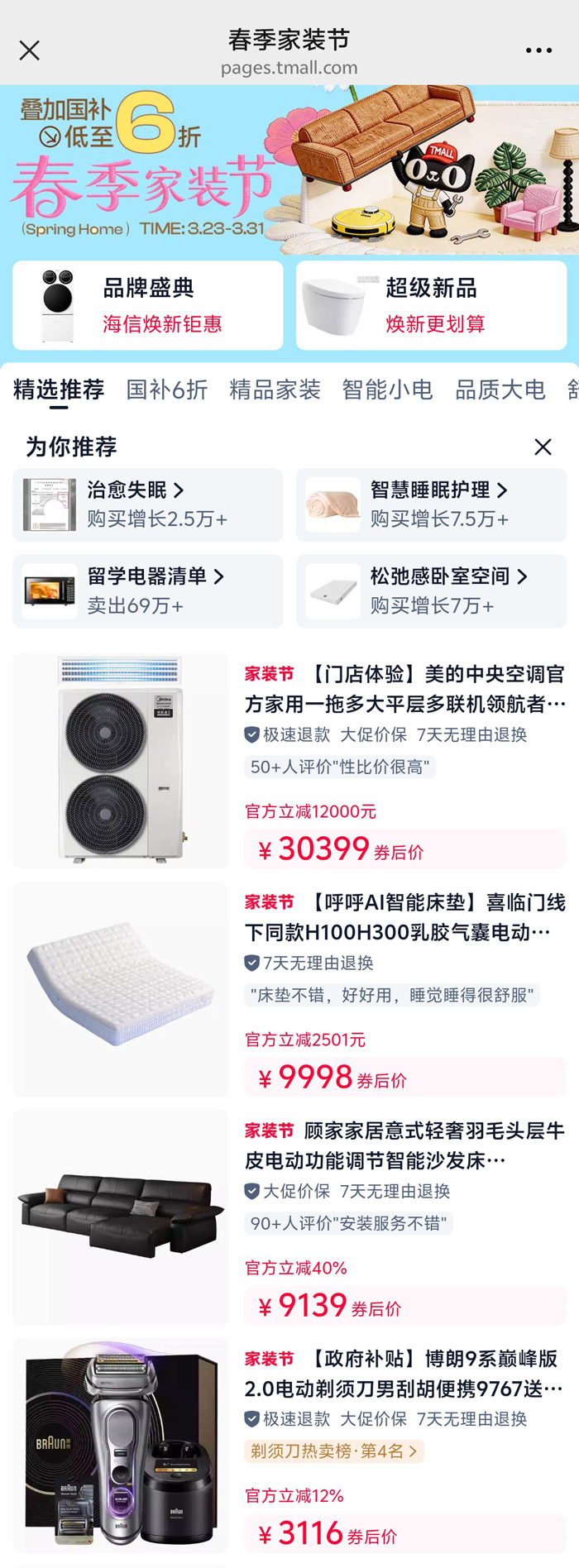 2026 天猫春季家装节深度洞察这些需求,以大牌直降 + 国补低至 6 折的核心福利,缓解预算焦虑;同时打造六大精细化选购分区,覆盖从硬装配套到软装日用、从小家电到大家电的全品类,让不同人群都能快速找到适配自己的家居好物,告别盲目选购、东奔西跑的焕新难题。