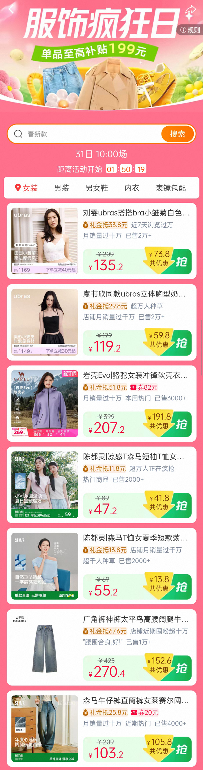 女装专区深度契合女性多场景穿搭需求,精选多款明星同款爆款单品,兼顾时尚性与实用性。刘雯同款 ubras 小雏菊内衣、虞书欣同款文胸,贴合都市女性对舒适贴身衣物的品质追求;陈都灵同款森马 T 恤简约百搭,适配学生群体、年轻职场人的日常休闲场景;骆驼三防冲锋衣则以硬核功能与亲民价格,成为户外出行、通勤防风的优选单品。多款好物以大幅优惠让利,切实降低女性穿搭消费成本。