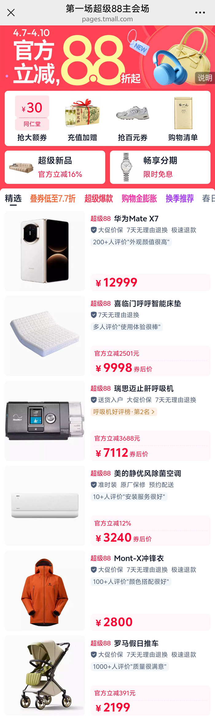 本次活动集结多款市场认可度极高的热门单品,覆盖数码、家居、服饰、母婴、美妆、健康等核心赛道,精准匹配不同人群消费偏好:华为 MATE X7、OPPO FIND N6 折叠屏手机,满足数码发烧友与商务人士的高端换机需求;喜临门智能床垫、美的除菌空调,为家庭用户打造健康舒适的居家环境;MONT-X、博格达 LT 冲锋衣适配春日露营、赏花出游等户外场景;罗马假日婴儿推车贴心守护母婴出行;修丽可 AGE 面霜、裘真 HOBO 女包、山下有松循迹浅行 HOBO 女包,满足时尚女性美妆穿搭需求;鱼跃制氧机、燕之屋燕窝则聚焦健康养生人群,提供高品质健康好物。