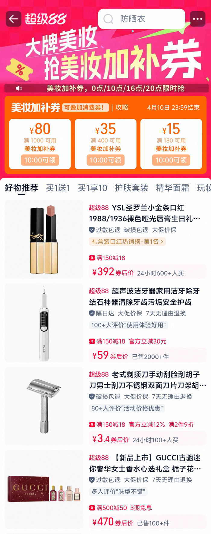 2026年4月7日,天猫超级88「大牌美妆,抢买1送1」主题促销活动正式上线,本轮活动将持续至4月10日23:59结束。覆盖彩妆、护肤、香氛、美容仪器等全品类美妆好物,以多元福利、精细化布局,为美妆爱好者打造便捷、实惠的一站式购物体验,近期有购买彩妆用品的小仙女们千万不要错过。