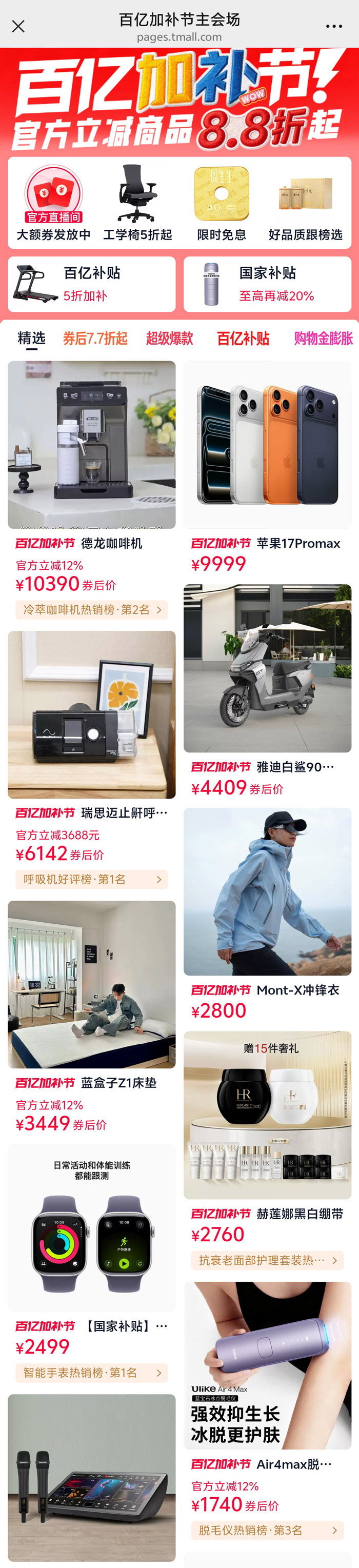 2026年4月23日,天猫 “百亿加补节” 主会场页面正式上线,以 “官方立减商品8.8折起” 为核心优惠,叠加百亿补贴、国家补贴、限时免息等多重福利,为消费者打造了一场覆盖数码、家居、美妆、户外、健康等全品类的品质消费盛宴。活动上线即引发市场广泛关注,多款兼具性价比与实力的爆款商品,成为不同消费场景下的热门选择。