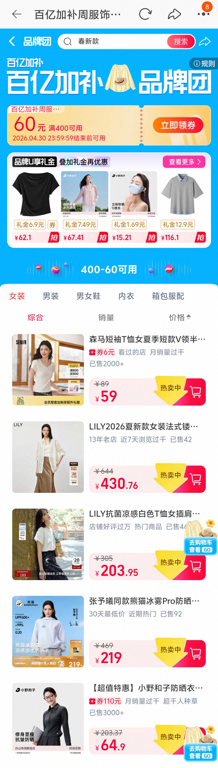 本次活动的核心福利,当属平台发放的满400减60元通用券,券面有效期至2026年4月30日23:59:59,领取后可直接用于会场内所有参与活动的品牌门店,轻松解锁春夏服饰大额直降。